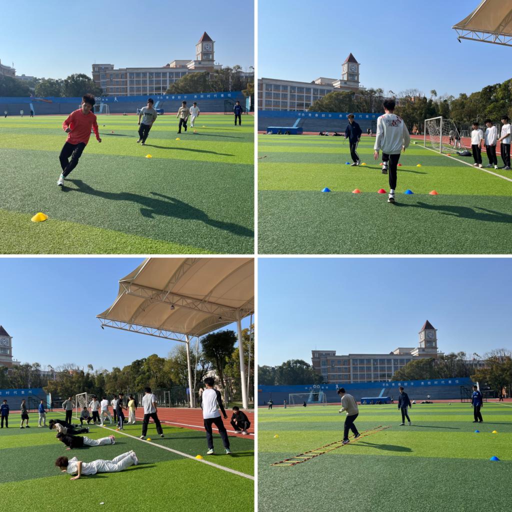 随后,支部学生党员杨嘉聪同志、第51期积极分子赖荣菲同学以足球专项为例,系统讲解速度与灵敏素质训练的科学原理,通过"变向跑+反应训练""绳梯组合练习"等创新方法,现场演示如何将体能训练与运动专项有机结合。实践环节中,支部党员有序带领同学们开展沉浸式练习,有效帮助低年级同学建立足球专项体能认知。