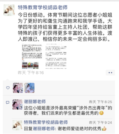 长沙市特殊教育学校老师对我院志愿者赞赏有加,并且发朋友圈表扬我院志愿者,谢丽娜老师也给这位志愿者小姐姐给予了极高的肯定。